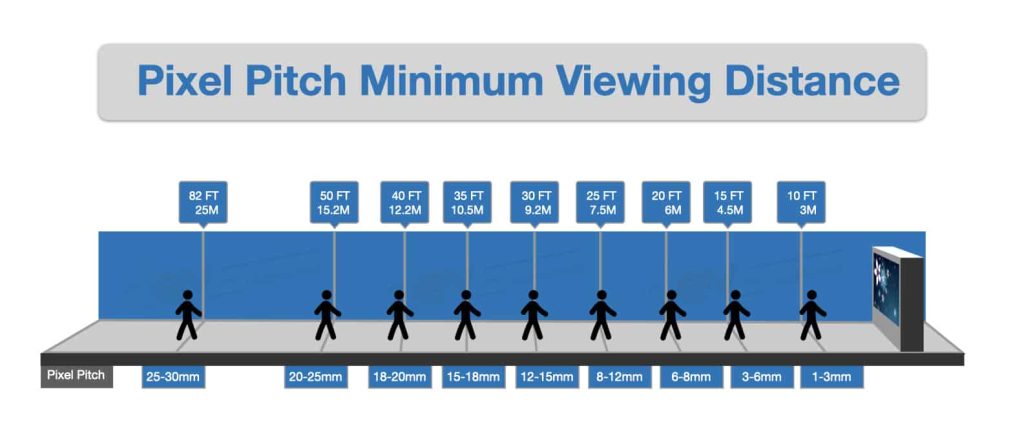 Salah satu faktor penting yang perlu dipertimbangkan dalam memilih videotron adalah jarak pandang penontonnya. Jarak di mana penonton atau audiens dapat melihat layar videotron dengan jelas. Pixel pitch memiliki pengaruh langsung terhadap jarak pandang yang optimal.