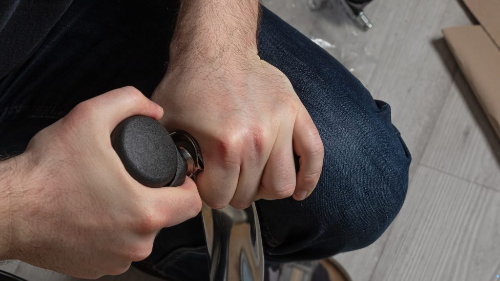 Setelah semua komponen bagian badan kursi sudah terpasang dengan baik, Langkah selanjutnya adalah memasangkannya ke tabung hidrolik yang sudah terpasang dengan kaki kursi. Untuk memastikan dudukan terpasang dengan benar, Anda dapat duduk dikursinya dan menekannya dengan kuat. Angkat bantalan kursi untuk memeriksa apakah pemasangannya sudah pas dan kuat. Pastikan dudukan kursi terpasang dengan kokoh untuk menghindari kejadian-kejadian yang tidak diinginkan.