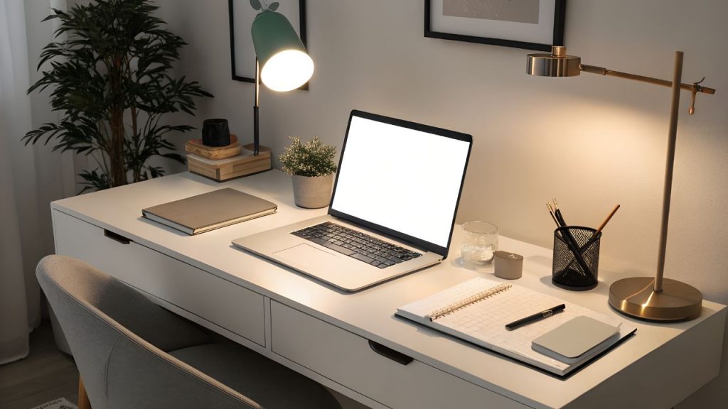 Untuk meningkatkan kenyamanan visual, maksimalkan pencahayaan alami. Menempatkan meja kerja di dekat jendela besar memungkinkan masuknya cahaya matahari yang cukup, memberikan energi positif sekaligus mengurangi ketergantungan pada lampu saat siang hari. Pada malam hari, gunakan lampu meja atau lampu gantung dengan cahaya hangat agar ruangan tetap terasa cozy dan tidak melelahkan mata.