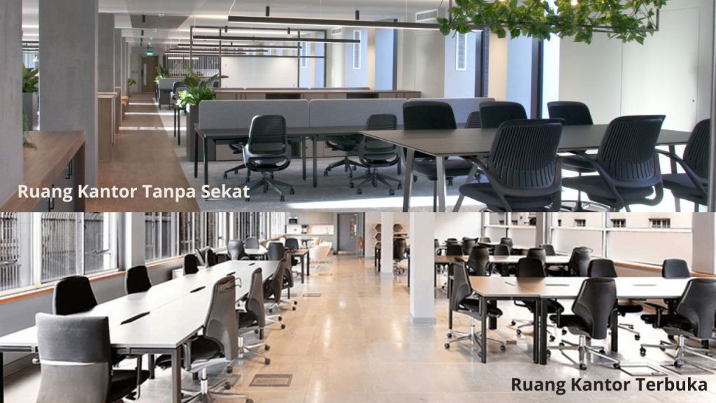 Sebaliknya, ruang kantor tanpa sekat memberikan variasi tata letak yang lebih luas. Walaupun tidak menggunakan dinding tetap, area kerja dapat dibedakan secara fungsional. Misalnya, area fokus dengan panel peredam suara, area kolaborasi terbuka, dan ruang diskusi semi-tertutup. Menurut panduan desain dari Steelcase dan Herman Miller, pendekatan ini mendukung aktivitas kerja yang beragam tanpa harus membangun ruang tertutup permanen.